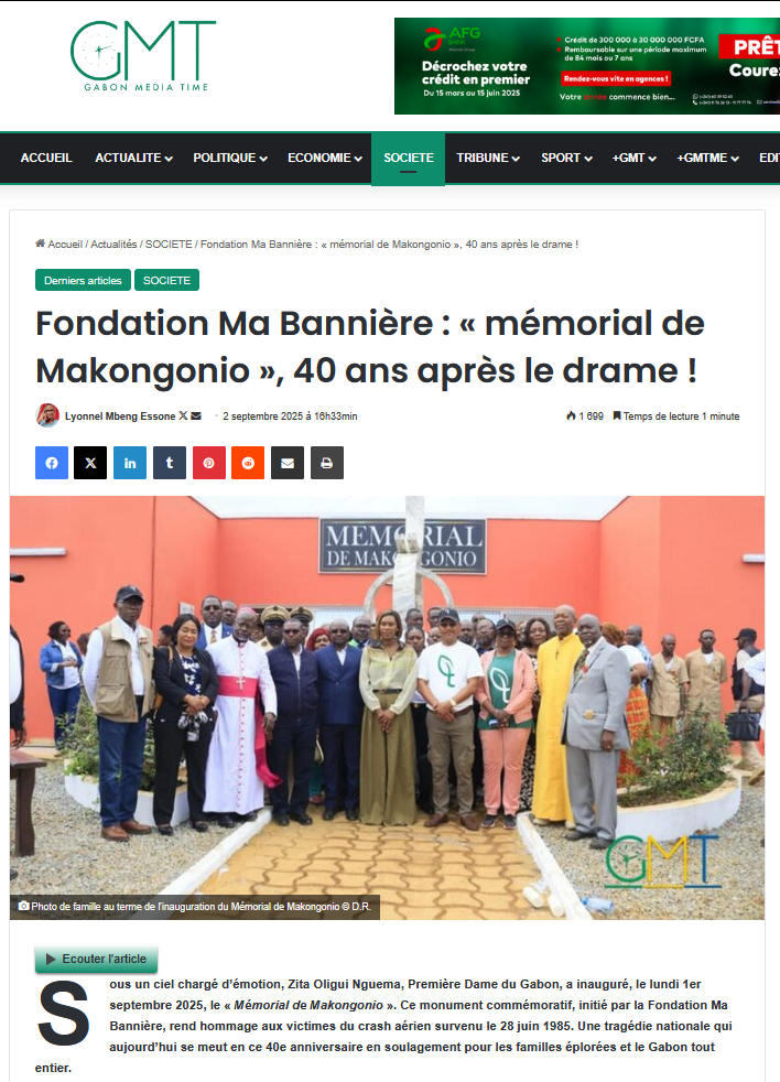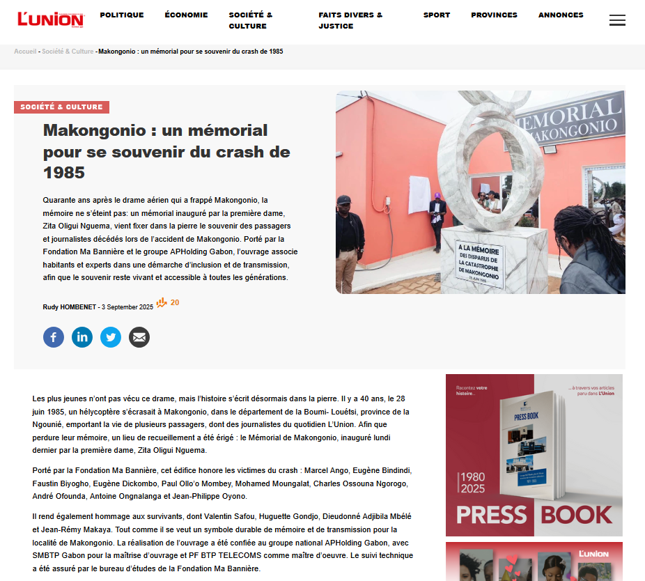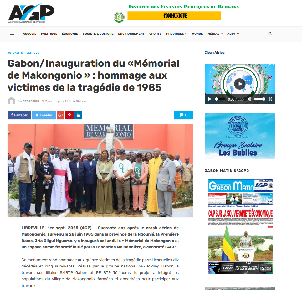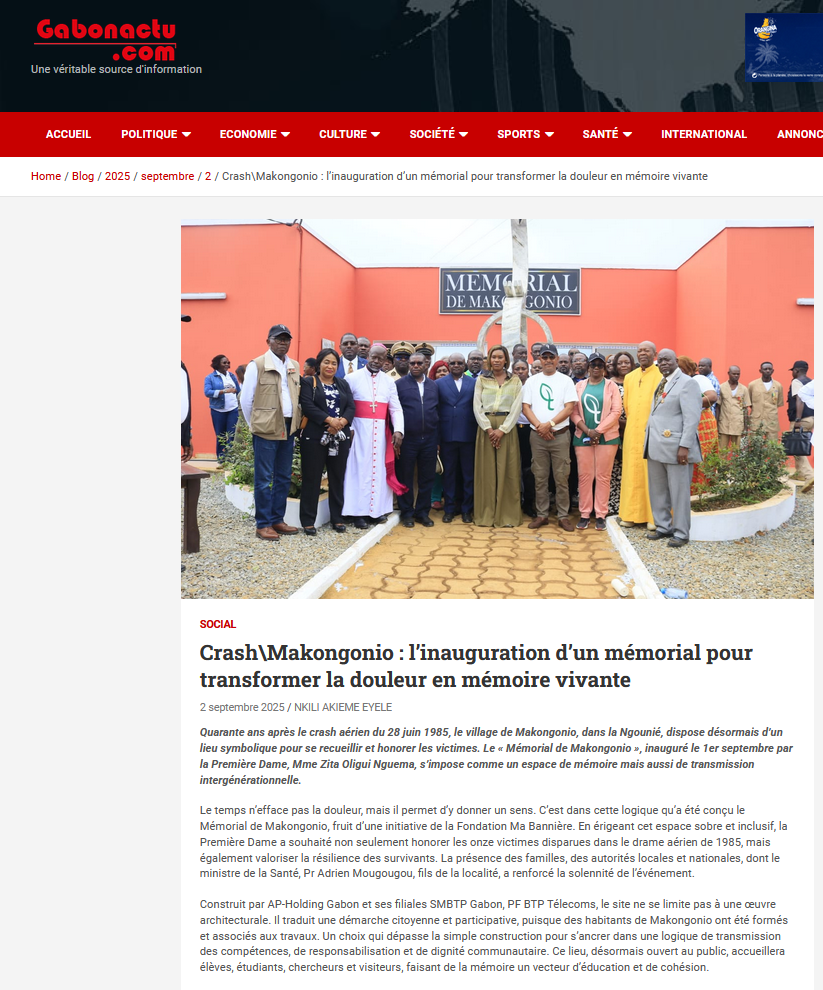 Le 28 juin 1985, un crash aérien plongeait Makongonio et le Gabon dans le deuil. Quarante ans plus tard, sous l’impulsion de la Fondation Ma Bannière et de Madame Zita OLIGUI NGUEMA, Première Dame du Gabon, la mémoire a trouvé un lieu de recueillement : le Mémorial de Makongonio.